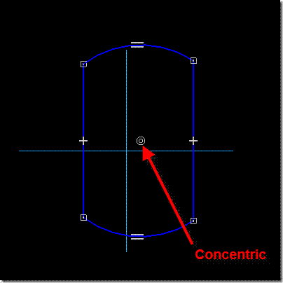The Concentric command forces two circles or arcs to share the same arc center. It is located on the Features and Relationships toolbar. The concentric constraint is displayed as two circles at the arc center of the selected curves.